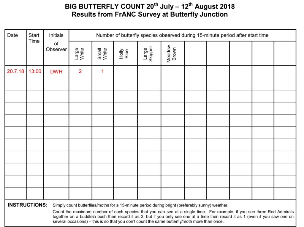 FrANC members and others have been monitoring the area for butterflies and day moths for several years and often take part in the nationwide annual Big Butterfly Count during a three-week period each summer in July/August.
